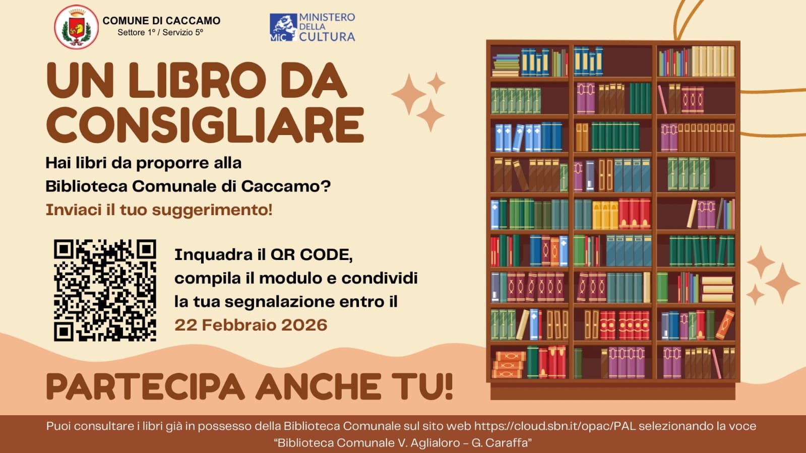 Compila il modulo tramite questo link: https://forms.gle/vXHJFBNsGpRKNQba9 e il tuo libro preferito e/o quello che vorresti si trovasse in biblioteca sarà inserito nell’elenco dei libri da acquistare grazie al contributo concesso alla nostra Biblioteca Comunale dal MINISTERO DELLA CULTURA.